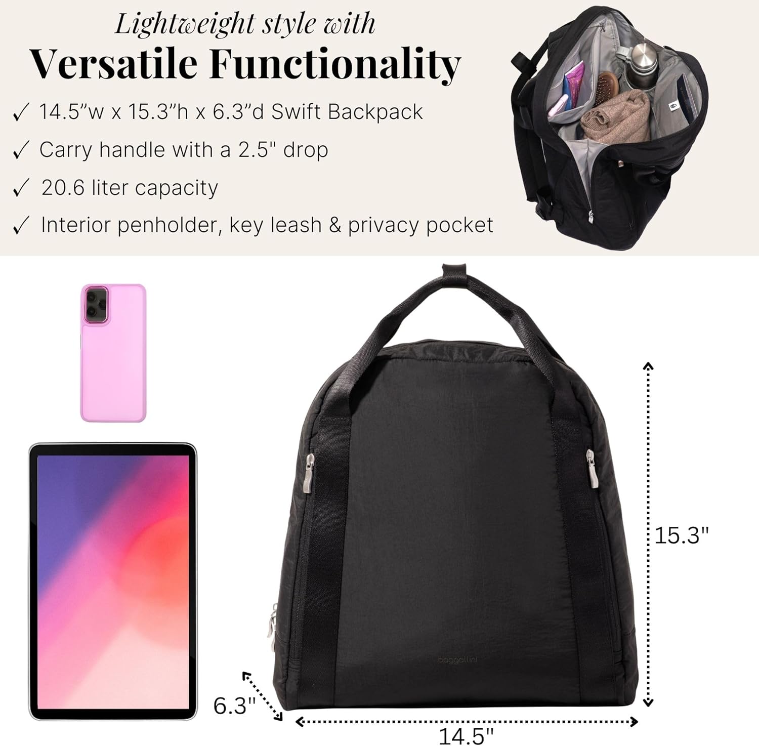 Glossy and minimalist, the Swift Backpack is designed to go wherever with out weighing you down. Crafted in ultra-light B-Lite material, it packs simply but delivers sensible performance with entrance zip pockets for small necessities and inside pockets that preserve your water bottle and different objects shut at hand. From journey days to gymnasium classes, Swift is the versatile companion that retains tempo with each transfer. Journey sensible, keep organized, and look polished with this ladies’s journey backpack designed for consolation and on a regular basis versatility. Crafted from sturdy, light-weight supplies, it’s ultimate for work, commuting, and weekend getaways. The padded backpack straps alter from 20 to 33 inches for a customized match, whereas the carry deal with with a 2.5-inch drop makes it simple to seize and go. A baggage deal with sleeve allows you to slide the backpack over your suitcase for hands-free airport journey, making it an ideal carry-on backpack for girls. Keep organized wherever you go along with two entrance zipper pockets, a privateness pocket, penholder, and key leash that preserve your necessities neatly saved and accessible. Two inside water bottle pockets match massive bottles, serving to you keep hydrated all through your day. The RFID-protected passport pocket helps defend private information from digital theft, providing peace of thoughts on the transfer. With compact dimensions of 4.5” W x 15.3” H x 6.3” D and a 20.6 L capability, this light-weight ladies’s backpack gives the proper steadiness of house and elegance with out including bulk. Whether or not you’re heading to the workplace, catching a flight, or exploring a brand new metropolis, this multi-functional journey backpack for girls combines trendy design, consolation, and sensible group—making it your go-to bag for each journey.