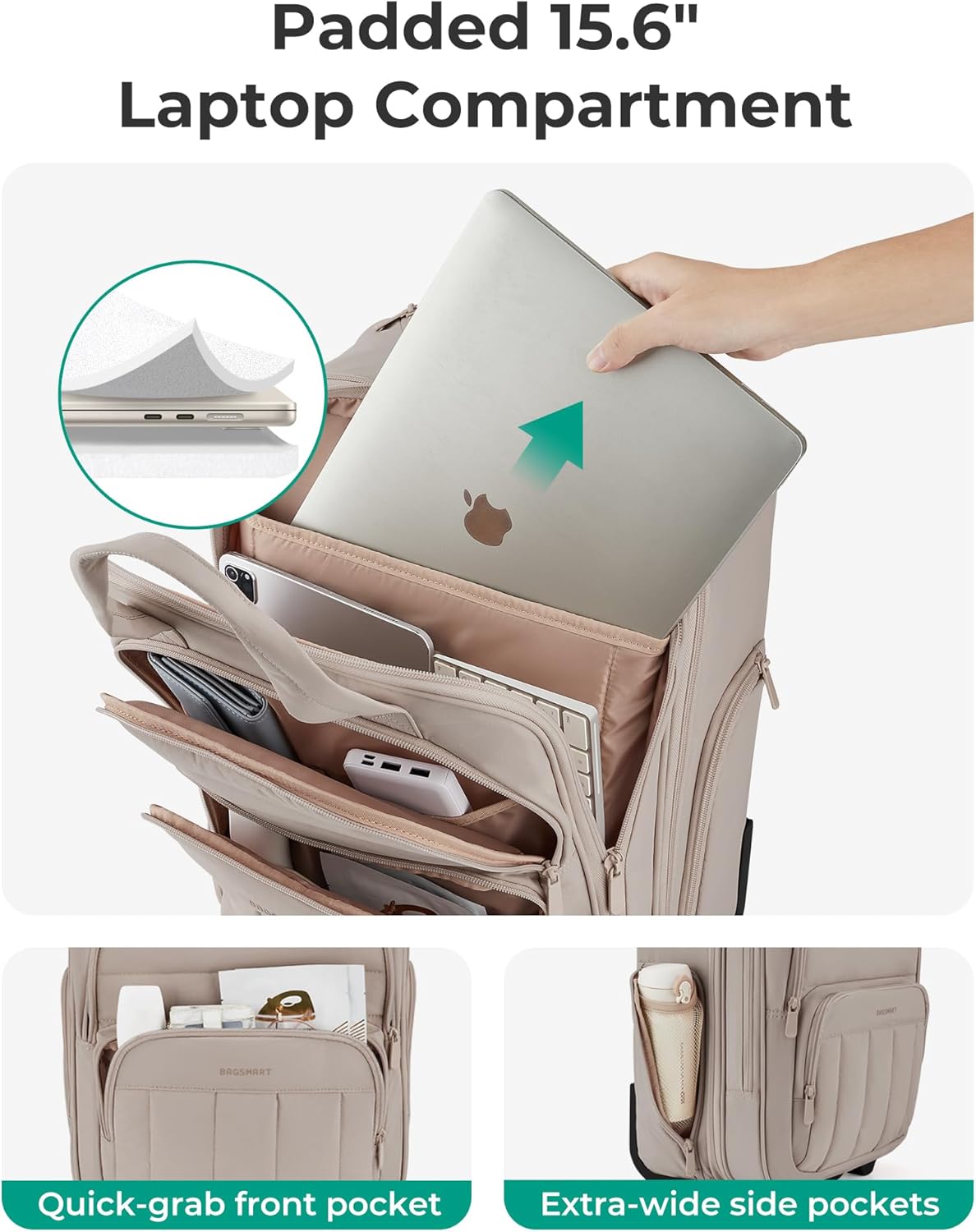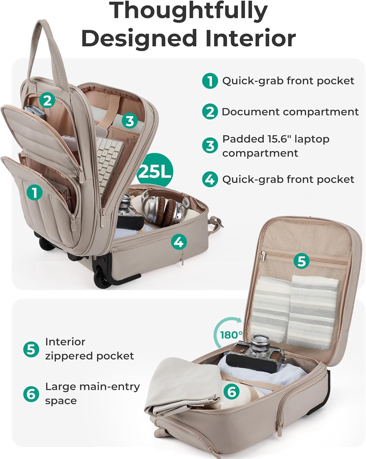 Organized Storage: Easy group is achieved with ample storage, inner compartments, and a small zippered pocket for smaller gadgets. The padded laptop computer compartment suits as much as a 15.6-inch laptop computer. Making it an excellent carry-on for 2-3 day in a single day journeys.