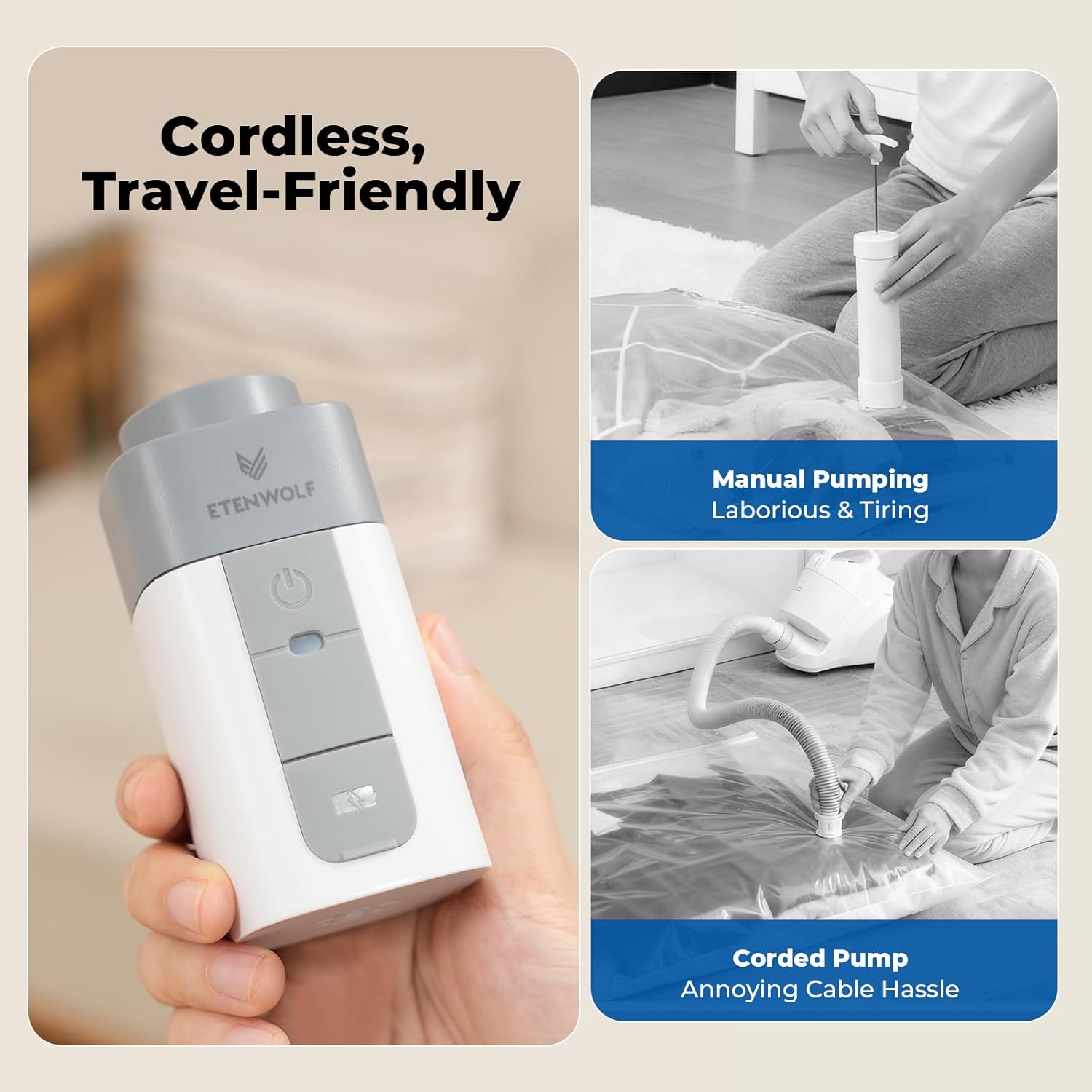 FAST & POWERFUL COMPRESSION: ETENWOLF area saver vacuum storage luggage improve your cupboard space by as much as 80%. ETENWOLF cordless air pump delivers a excessive airflow of 13 CFM (360 L/min), permitting every vacuum bag to be compressed in simply 10–15 seconds. Simply retailer garments, bedding, blankets, and journey necessities.