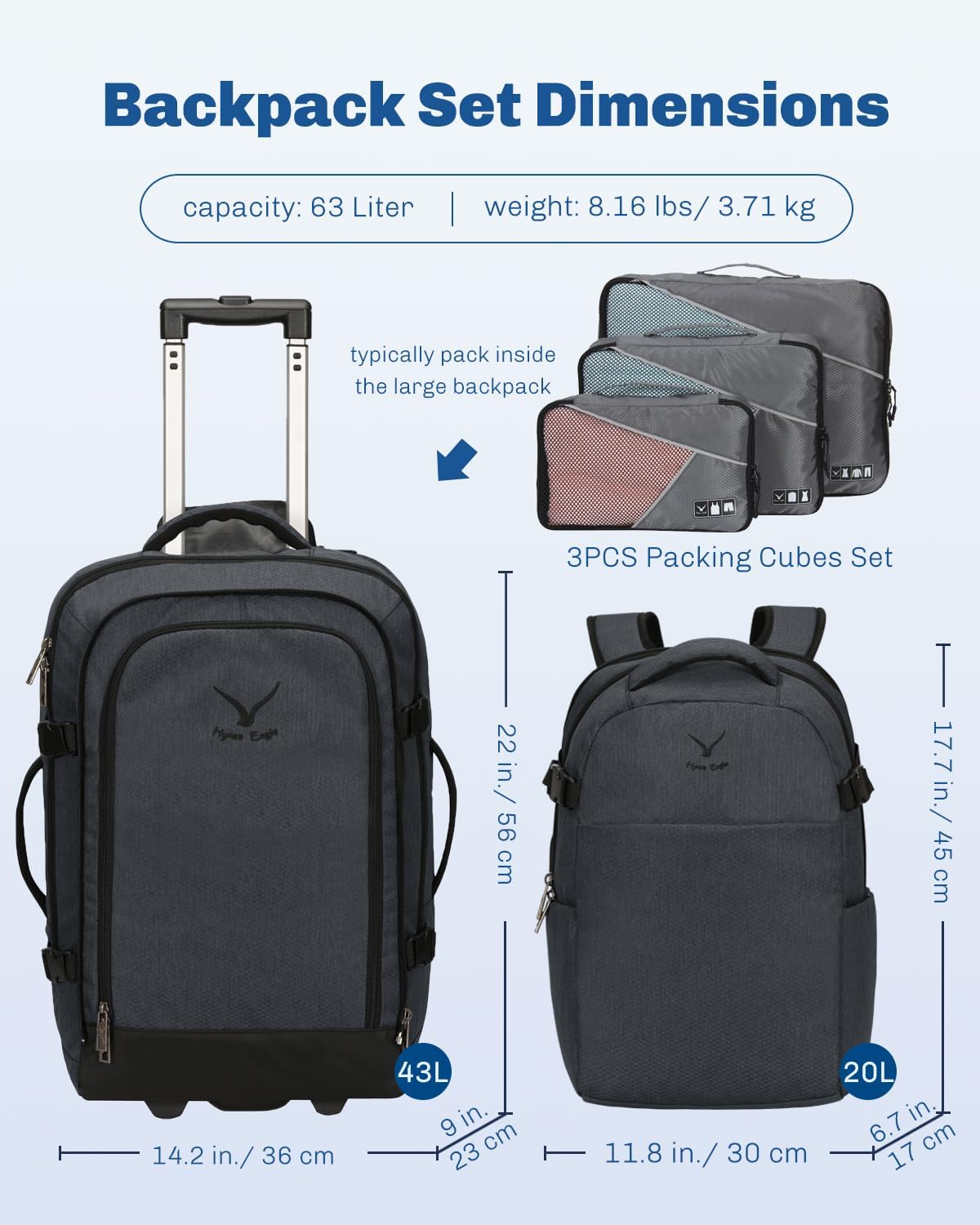 Hynes Eagle 2 in 1 Travel Backpack 22 inches Carry on Luggage 63L Rolling Backpack for Men Women with Packing Cubes 3PCS Set