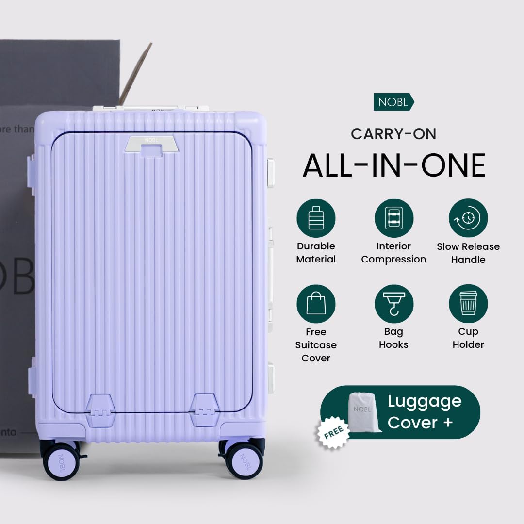 Nobl Travel Carry On Luggage, Noble Zipperless Aluminum Frame PC Hard Shell Suitcase, 22.5x15x9.5 Airline Approved, 360° Spinner Wheels, TSA Locks, USB Charging Port, Cup & Phone Holder – Lavender