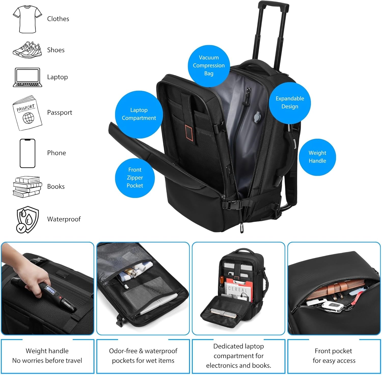 Vacuum Travel Backpack with Wheels, Expandable Carry On Luggage, Luggage Vacuum Bags with Pump, Weight Handle, USB Charging Port, Waterproof
