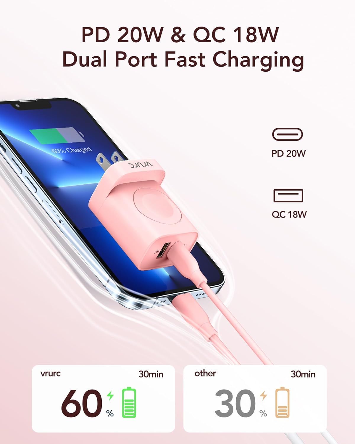 VRURC Charger for iPhone & Apple Watch, 20W USB C Fast Charging Block, 3-in-1 Compact Travel Adapter with 2 Port for iPhone 17/16/15/14/13, Wireless Magnetic for iWatch SE/11/10/9/8/7/6/5/4-Pink